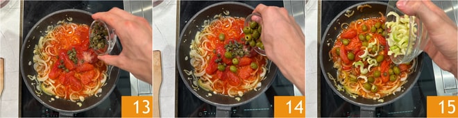 Ajoutez également les câpres dessalées 13, les olives vertes 14 et le céleri émincé 15.