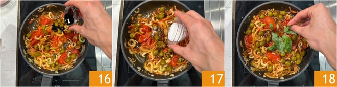 Ajoutez maintenant le vinaigre 16, le sucre 17 et les feuilles de basilic 18.