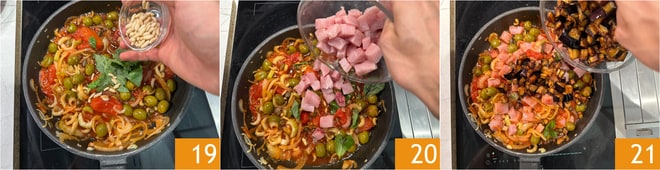 Ajoutez les pignons 19, l'espadon en dés 20 et les aubergines frites 21.