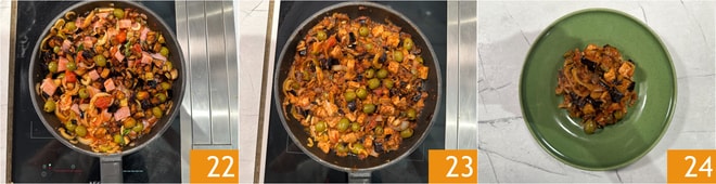 Faites cuire pendant 15 minutes à feu moyen 22. Une fois prête 23, rectifiez l'assaisonnement en sel, épicez avec du poivre selon votre goût et servez immédiatement votre caponata de poisson à l'espadon 24!