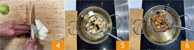 Enfin, épluchez et émincez l'oignon 4. Dans une petite casserole, chauffez l'huile de graines jusqu'à 175°, puis plongez-y les aubergines en dés 5. Faites-les frire jusqu'à ce qu'elles soient dorées, environ 2-3 minutes, puis égouttez-les 6.