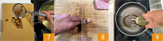 Transférez les aubergines frites sur un plateau recouvert de papier absorbant 7, afin d'éliminer l'excès d'huile. Coupez l'espadon en dés d'environ 2 cm 8. Chauffez l'huile dans une poêle 9.