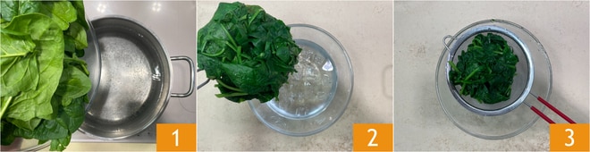 Pour préparer les cappellacci aux crevettes et artichauts, commencez par préparer les pâtes fraîches aux épinards à l'œuf: blanchissez-les dans l'eau bouillante salée 1, le temps nécessaire pour les ramollir. Égouttez-les et transférez-les dans un bol avec de l'eau glacée pour maintenir la couleur verte vive 2. Pressez-les avec une passoire 3.