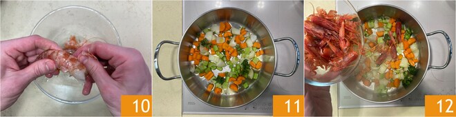 Nettoyez les crevettes et conservez les déchets 10. Dans une poêle, faites revenir un peu d'huile avec une hachure grossière de carotte, d'oignon et de céleri 11. Ajoutez les déchets de nettoyage des crevettes 12.