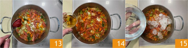 Ajoutez la marjolaine et une cuillère de concentré de tomate 13. Faites griller le tout, puis déglacez avec le cognac 14 et, si vous le souhaitez, vous pouvez également flamber avec précaution. Couvrez d'eau froide et de glace 15.