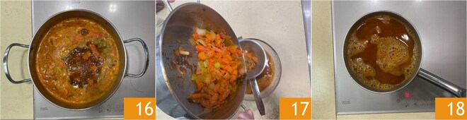 Faites cuire le fumet pendant 25 minutes à feu doux 16. Puis filtrez-le à travers une passoire 17 et remettez-le à feu doux 18 jusqu'à ce qu'il réduise, cela prendra au moins 20 minutes.