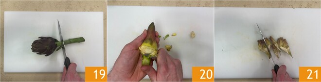 Nettoyez maintenant les artichauts: séparez la tige 19, retirez les feuilles extérieures les plus dures et avec un couteau épluchez la partie extérieure coriace 20. Coupez les cœurs en quartiers 21 et retirez le foin interne.