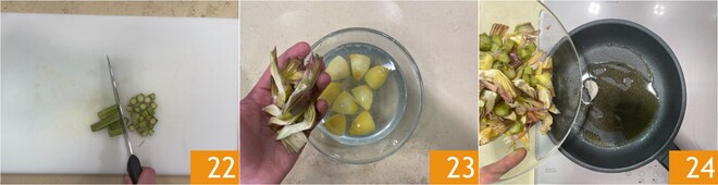 Épluchez également la tige et réduisez-la en morceaux 22. Conservez les artichauts nettoyés dans de l'eau citronnée, afin qu'ils ne noircissent pas 23. Dans une poêle, chauffez un peu d'huile avec une gousse d'ail écrasée, versez les artichauts 24.