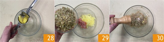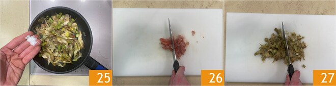 Ajoutez le sel 25 et le poivre blanc, puis faites-les sauter pendant une dizaine de minutes pour les ramollir, en ajoutant une goutte d'eau si nécessaire. Hachez les crevettes nettoyées 26 et les artichauts cuits 27.