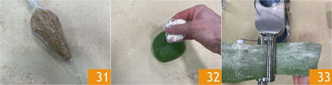 Transférez la farce dans une poche à douille 31. Sortez la pâte, farinez-la légèrement 32 et passez-la dans la machine à pâtes 33, en commençant par l'épaisseur la plus large jusqu'à atteindre une épaisseur d'environ 2-3 mm.
