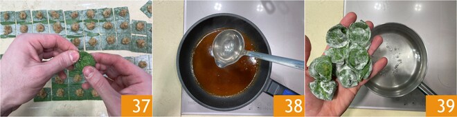 Repliez les deux extrémités vers le centre et joignez-les 37. Pendant ce temps, faites bouillir l'eau pour les pâtes. Transférez le fumet réduit dans une grande poêle avec une louche d'eau de cuisson des cappellacci. Faites cuire les cappellacci jusqu'à ce qu'ils remontent à la surface 39, cela prendra quelques minutes.