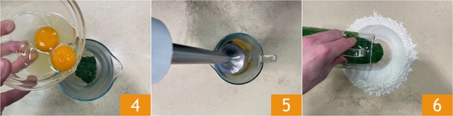 Transférez les épinards dans un pichet, ajoutez les œufs 4, le sel et un filet d'huile. Mixez avec un mixeur plongeant 5 pour obtenir une crème. Sur le plan de travail, versez la farine en fontaine, placez la crème d'épinards au centre 6.
