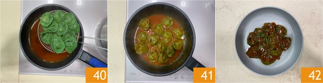 Égouttez les ravioli dans la poêle avec l'assaisonnement 40 et sautez-les brièvement, puis éteignez le feu et mélangez avec un filet d'huile 41. Servez vos cappellacci aux crevettes et artichauts en parfumant les assiettes avec des feuilles de marjolaine fraîche 42!