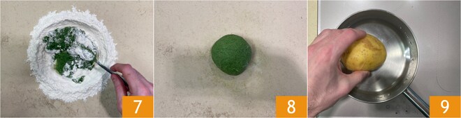 Mélangez d'abord avec la fourchette 7, puis continuez à la main jusqu'à obtenir une pâte homogène et compacte 8. Couvrez avec du film plastique et laissez au réfrigérateur pendant 30 minutes. Pendant ce temps, préparez la farce: faites cuire la pomme de terre 9 jusqu'à ce qu'elle soit tendre.
