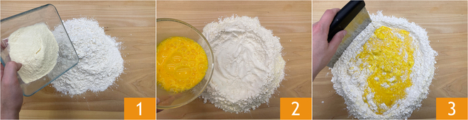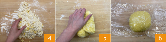 Lorsque le mélange commence à prendre consistance, continuez à travailler à la main 4 jusqu'à obtenir une pâte compacte 5. Enveloppez-la dans du film plastique et laissez reposer environ une demi-heure dans un endroit frais 6.
