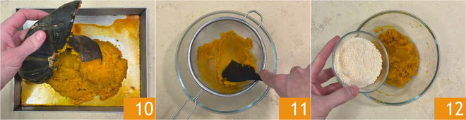 Cuisez au four statique préchauffé à 200°, pendant environ 45 minutes. Quand la courge est tendre, retirez la peau 10 et écrasez la chair; pour obtenir une consistance lisse et crémeuse, vous pouvez la passer au tamis 11. Ajoutez le fromage râpé 12.