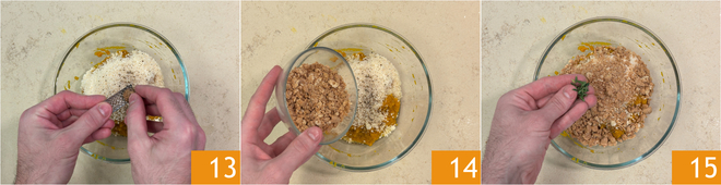 Ajoutez également la noix de muscade râpée 13, les amaretti émiettés 14 et le thym effeuillé 15.