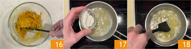 Mélangez bien, puis transférez la farce dans une poche à douille et placez au réfrigérateur pendant une vingtaine de minutes 16. Pendant ce temps, préparez la fondue : faites fondre le beurre dans une casserole, puis ajoutez la farine 17. Mélangez bien avec une spatule en prenant soin que la farine ne brûle pas, cela prendra quelques minutes 18.