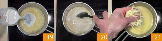 Quand la farine est bien dorée, versez le lait petit à petit 19 et continuez à mélanger à feu doux 20. Dès que cela commence à frémir, ajoutez la provola fumée que vous aurez préalablement râpée 21.