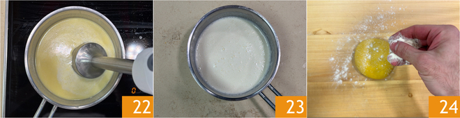 Mélangez pour faire fondre complètement le fromage, puis éteignez le feu et mixez 22 pour obtenir une fondue lisse et filante 23. Reprenez le pâton de pâte et saupoudrez-le légèrement de farine 24.