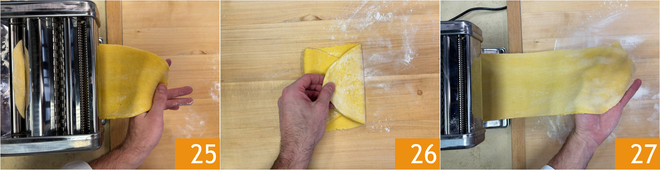 Étalez la pâte avec une machine à pâte, en commençant par l'épaisseur la plus large des rouleaux 25 et en la réduisant progressivement, en repliant les feuilles entre chaque passage pour les renforcer 26. Continuez à étendre la pâte jusqu'à atteindre une épaisseur d'environ 1-1,5 mm 27.