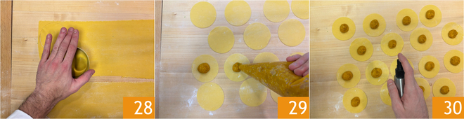 Avec un emporte-pièce de 7-8 cm de diamètre, découpez des disques 28; avec ces doses, vous en obtiendrez environ 24, vous pouvez réutiliser les chutes et les étaler à nouveau après le temps de repos de la pâte. Pressez une petite noisette de farce de courge et d'amaretti au centre de chacun 29. Vaporisez un peu d'eau sur les bords pour faciliter la fermeture 30.