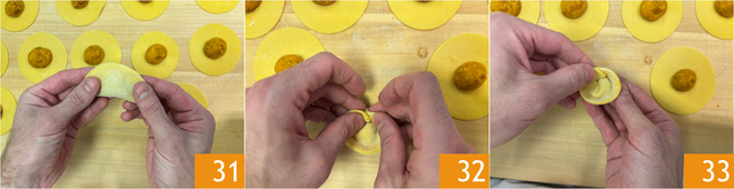 Ployez les disques en demi-lune 31, puis repliez les extrémités jusqu'à les faire se rejoindre et pincez-les ensemble 32. Après avoir formé tous les cappellacci, faites-les cuire dans de l'eau salée et à léger frémissement pendant quelques minutes 33.