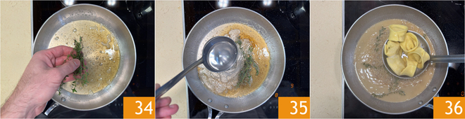 Entre-temps, préparez l'assaisonnement : faites fondre le beurre dans une poêle à feu doux, lorsqu'il devient d'une belle couleur noisette, ajoutez le thym 34 et une louche d'eau de cuisson des pâtes 35. Bougez légèrement la poêle pour amalgamer l'assaisonnement et le rendre crémeux. Égouttez les cappellacci dans la poêle 36.