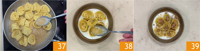 Laissez-les s'imprégner rapidement en les nappant de l'assaisonnement 37. Vous êtes prêt à dresser : répartissez la fondue à la base de l'assiette, puis ajoutez les cappellacci avec l'assaisonnement 38 et complétez avec quelques amaretti émiettés à l'instant. Vos cappellacci farcis à la courge et aux amaretti sur fondue de provola sont prêts à être servis 39!