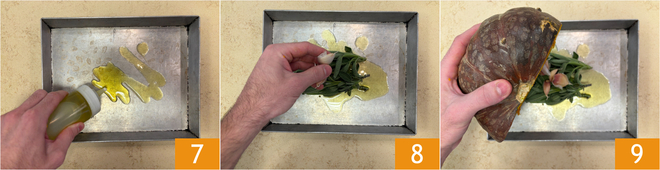Entre-temps, occupez-vous de la farce : sur une plaque de cuisson, versez un peu d'huile 7, puis formez un petit tas avec les feuilles de sauge et les gousses d'ail 8. Placez la courge coupée en deux, déjà vidée des graines, côté coupé vers le bas en englobant les arômes dans la cavité 9.