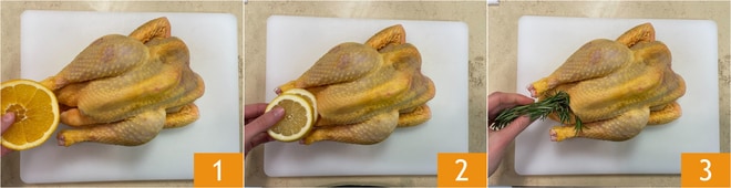 Pour préparer le chapon aux agrumes, commencez par la farce : mettez à l'intérieur deux tranches d'orange 1 et deux de citron 2. Ajoutez aussi les herbes aromatiques : thym et romarin 3.