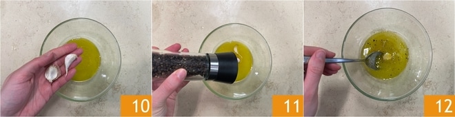 Assaisonnez avec les gousses d'ail écrasées 10, du sel, du poivre et mélangez 12.