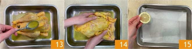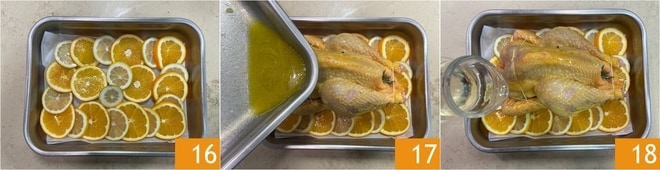 Versez la marinade sur le chapon 13 et massez-le bien pour l'assaisonner 14. Laissez mariner au réfrigérateur pendant au moins 2 heures (de préférence toute la nuit). Pendant ce temps, massez-le de temps en temps. Une fois le temps de marinade écoulé, placez une feuille de papier sulfurisé sur une plaque, répartissez les tranches d'orange et de citron 15