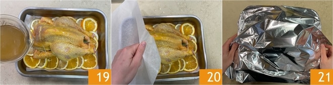 Enfin, versez aussi le bouillon de volaille 19. Couvrez avec une feuille de papier sulfurisé et 20 et une d'aluminium 21. Faites cuire le chapon dans un four préchauffé à chaleur tournante à 180 °C pendant environ une heure.