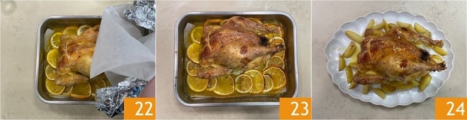 Après la première heure, retirez les feuilles de couverture 22 et continuez à cuire pendant encore 30-45 minutes, en arrosant le chapon avec le jus de cuisson de temps en temps, jusqu'à ce que la peau devienne dorée et croustillante 23. La température interne devrait atteindre 75 °C. Une fois cuit, sortez le chapon du four et laissez-le reposer pendant 15-20 minutes avant de le servir. Accompagnez le chapon aux agrumes de Pommes de terre au four ou d'une Purée de pommes de terre 24.