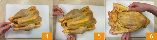 Ajoutez également l'ail écrasé 4 puis attachez-le pour le maintenir compact pendant la cuisson : faites passer une ficelle de cuisine autour des pattes 5 et serrez bien. Ensuite, amenez les deux fils vers la poitrine, puis retournez le chapon et croisez les fils en fixant bien les ailes 6.