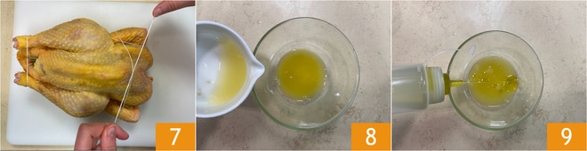 Retournez à nouveau le chapon et ramenez le fil devant, près du cou, ici faites quelques nœuds de fermeture 7. Coupez l'excédent de fil. Mettez le chapon de côté et occupez-vous de la marinade : dans un bol, versez le jus d'orange et de citron 8, ajoutez l'huile d'olive 9.