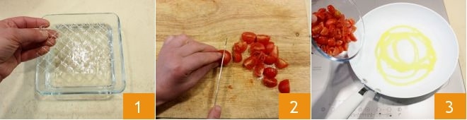 Pour préparer la caprese fingerfood, faites tremper la gélatine en feuilles dans un bol d'eau froide pendant au moins 10 minutes 1. Lavez les tomates cerises à grande eau fraîche, puis coupez-les en deux 2 et faites-les revenir dans une grande poêle antiadhésive avec l'huile 3,