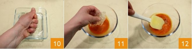 Une fois le temps écoulé, essorez la gélatine en feuilles 10 et ajoutez-la à la sauce chaude que vous avez préparée 11, en mélangeant avec la spatule 12 jusqu'à ce que la gélatine soit complètement dissoute.