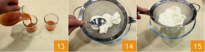 Composez la première couche de votre caprese en versant la sauce dans 4 verrines d'une capacité de 100 ml 13, puis placez-les au réfrigérateur pour raffermir pendant au moins 1 heure. Pendant ce temps, préparez la deuxième couche, en plaçant la stracciatella dans une passoire fine et en pressant avec le dos d'une cuillère à café 14 pour libérer l'excès de liquide 15. Laissez égoutter la stracciatella et préparez la crème de basilic.