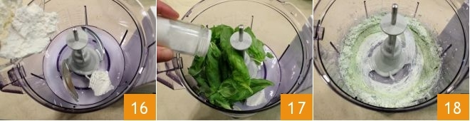 Placez la ricotta dans un mixeur équipé de lames 16 et ajoutez les feuilles de basilic, en assaisonnant de sel 17 et de poivre à votre goût. Actionnez les lames jusqu'à obtenir un mélange homogène et crémeux 18, que vous allez mettre dans une poche à douille sans embout, à laquelle vous pouvez faire un trou.