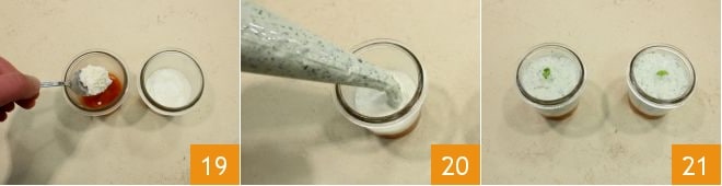 Une fois le temps écoulé, continuez avec la composition des verrines : effilochez la stracciatella et réalisez la deuxième couche 19, enfin terminez en versant la crème de basilic jusqu'au bord à l'aide de la poche à douille 20 : votre caprese fingerfood est prête à être servie et dégustée ; vous pouvez la décorer avec de petites feuilles de basilic 21.