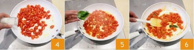 en assaisonnant de sel 4 et de poivre. Ajoutez les feuilles de basilic 5 et mélangez avec une spatule, en laissant cuire à feu modéré pendant 20 minutes. Une fois que les tomates cerises sont prêtes 6, éteignez le feu