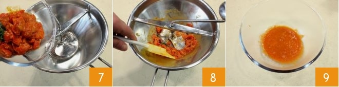et passez-les au moulin à légumes 7, en insistant particulièrement sur les peaux 8, afin d'obtenir une sauce 9.