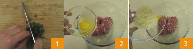 Pour réaliser les capù, commencez par laver et hacher le persil 1. Dans un bol, mettez la viande hachée, l'œuf entier 2, puis ajoutez le fromage râpé 3