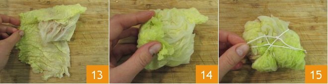 Enroulez d'abord un bord autour 13, puis l'autre, de manière à fermer complètement le rouleau 14. À ce stade, enveloppez les bouchées avec de la ficelle de cuisine 15.