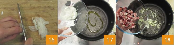 Occupez-vous maintenant de la sauce : épluchez l'oignon et émincez-le finement 16. Chauffez l'huile d'olive dans une casserole, ajoutez l'oignon 17 et faites-le revenir pendant 5 minutes à feu moyen, puis ajoutez également les dés de lard 18.