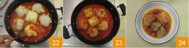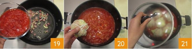 Faites cuire encore quelques minutes, puis versez la pulpe de tomate 19, salez et ajoutez les rouleaux de chou 20. Faites cuire pendant 30-40 minutes avec le couvercle 21.