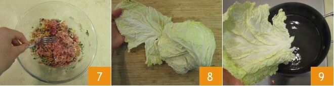 Mélangez avec une fourchette pour amalgamer la pâte 7 et réservez. Maintenant, épluchez le chou et choisissez les feuilles les plus grandes et intactes 8. Blanchissez les feuilles de chou pendant 3-4 minutes 9,
