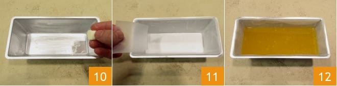 Préparez maintenant un moule à cake ou un autre moule de votre choix : beurrez-le 10 et tapissez-le de papier sulfurisé découpé en bandes pour mieux l’adapter aux parois 11. Versez alors le mélange à l'orange dans le moule jusqu'à atteindre une épaisseur de 1,5 cm 12.
